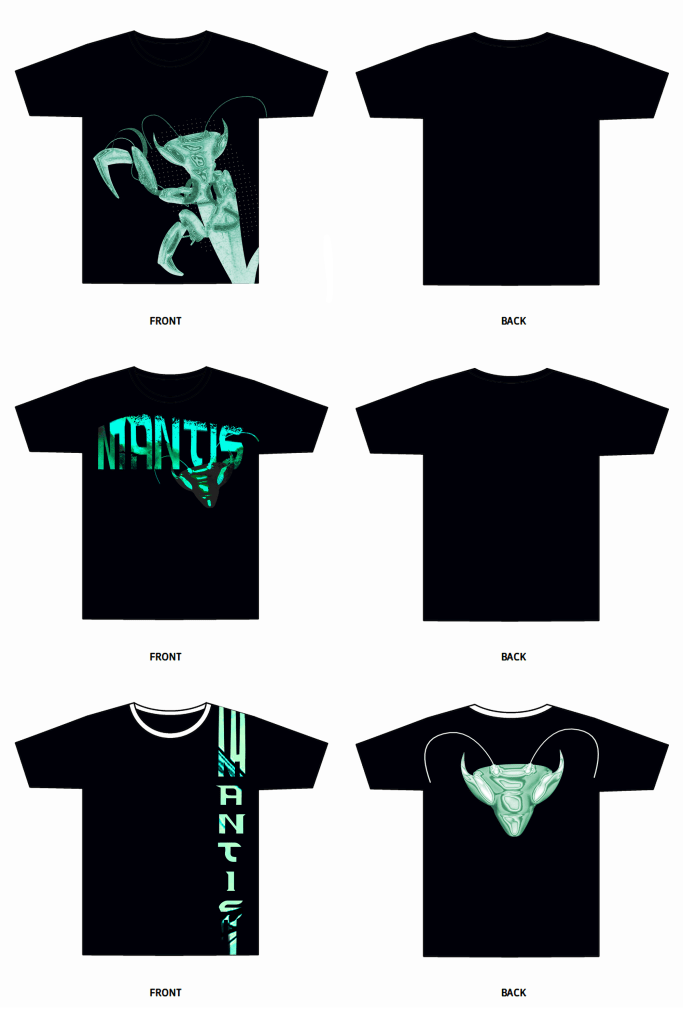 The t-shirt design was created to include the Mantis asset with creative text design. The idea is to have a shirt that uses both elements to create an identifiable brand image. The ideas were sketched and then narrowed down to 3 designs to mockup.